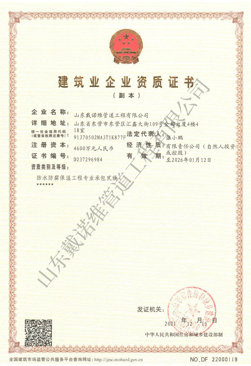 管道非開挖修復工程服務企業資質證書